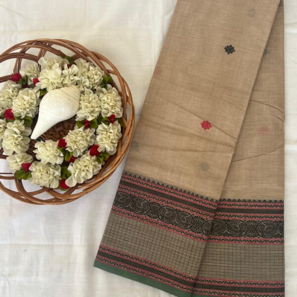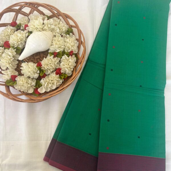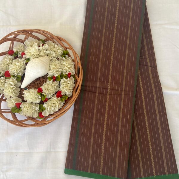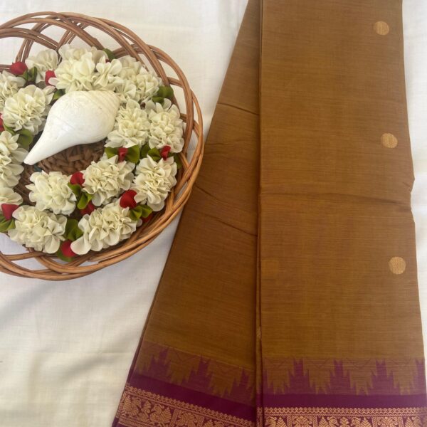 Crafted with precision by Kanchipuram weavers, this Kanchi Cotton Saree blends simplicity with heritage. The fabric stays cool on the skin, while the contrast borders add a touch of sophistication to your everyday look.