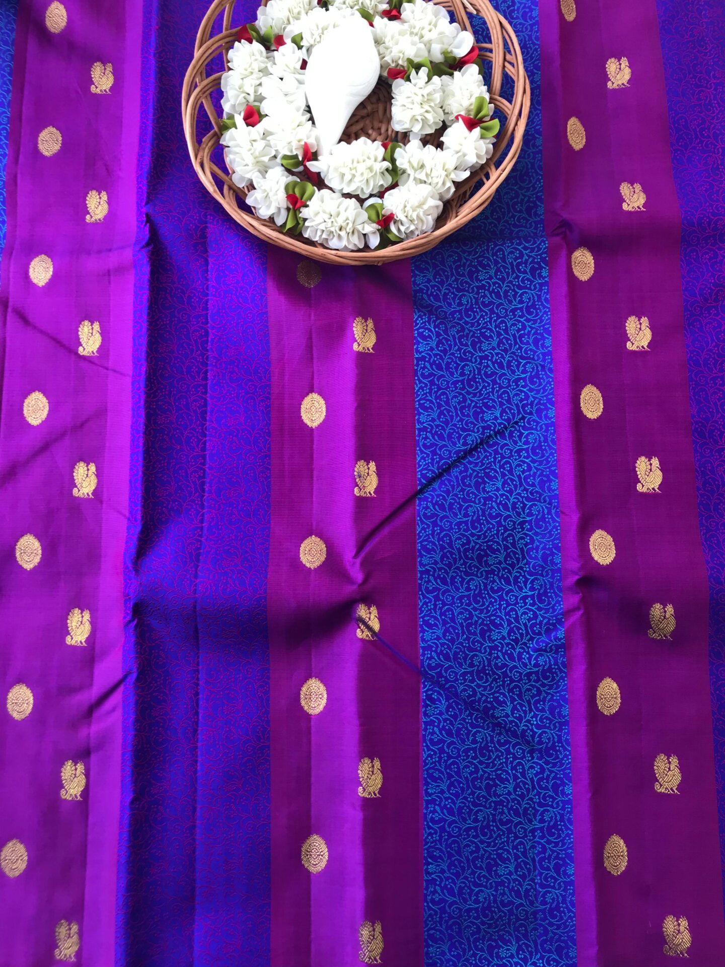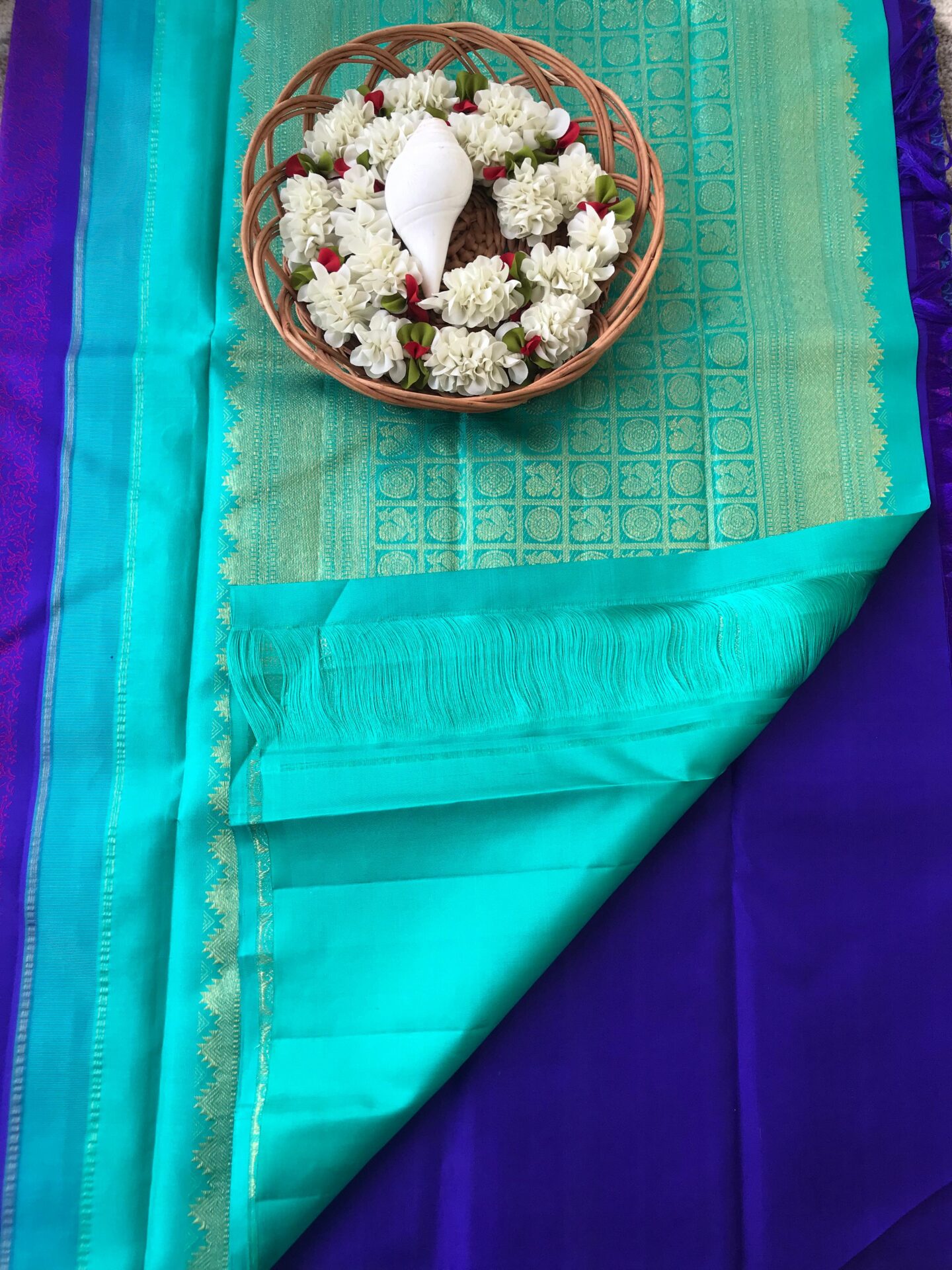 Korvai design Kanchipuram silk saree in contrast colour.