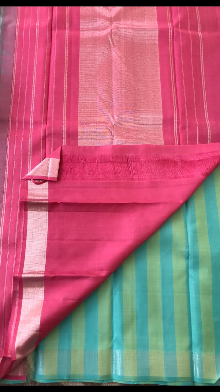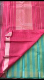 Pink with blue combination kanchipuram silk saree in veldhari design