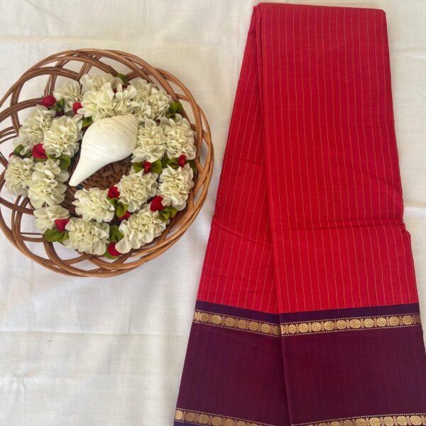 Crafted with precision by Kanchipuram weavers, this Kanchi Cotton Saree blends simplicity with heritage. The fabric stays cool on the skin, while the contrast borders add a touch of sophistication to your everyday look.