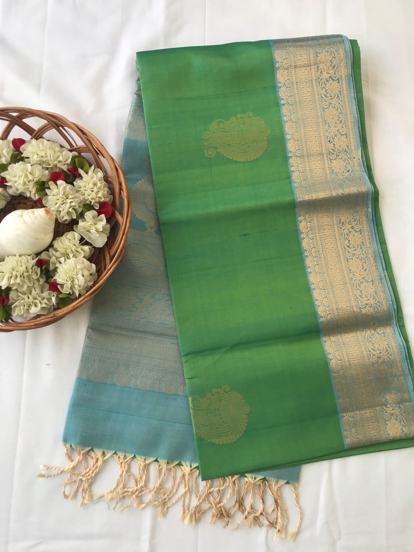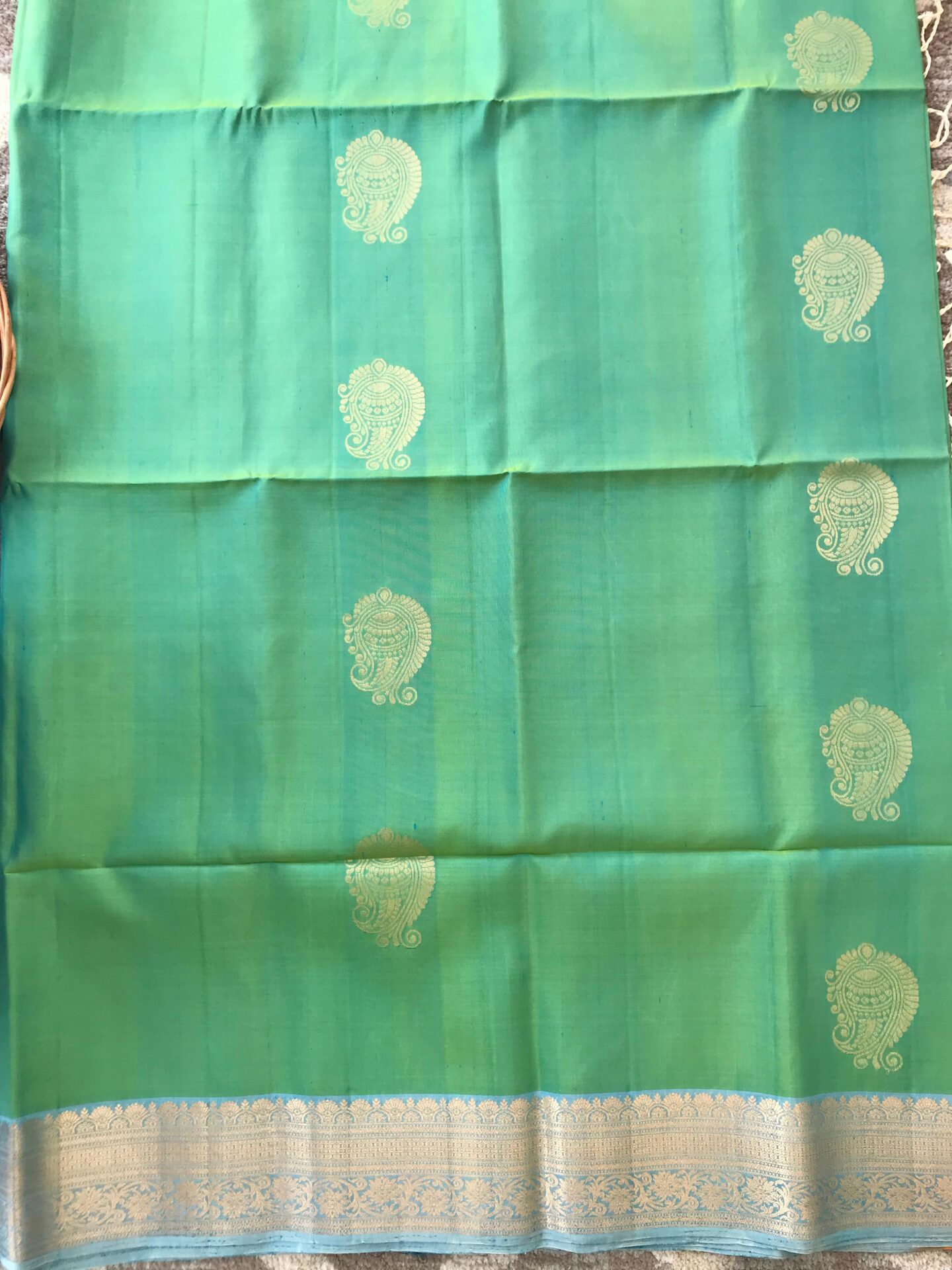 Turning border soft silk saree in bluish green colour.