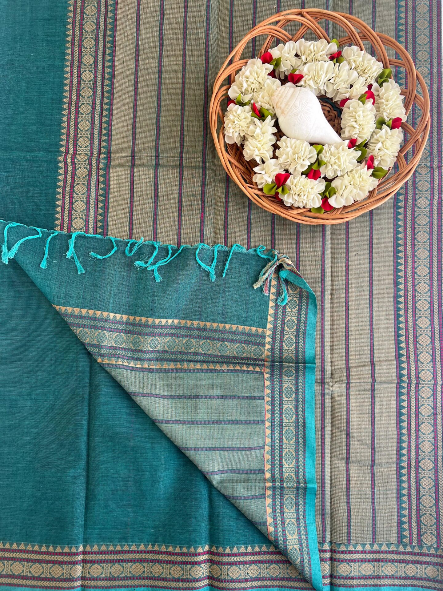 Crafted with precision by Kanchipuram weavers, this Kanchi Cotton Saree blends simplicity with heritage. The fabric stays cool on the skin, while the contrast borders add a touch of sophistication to your everyday look.